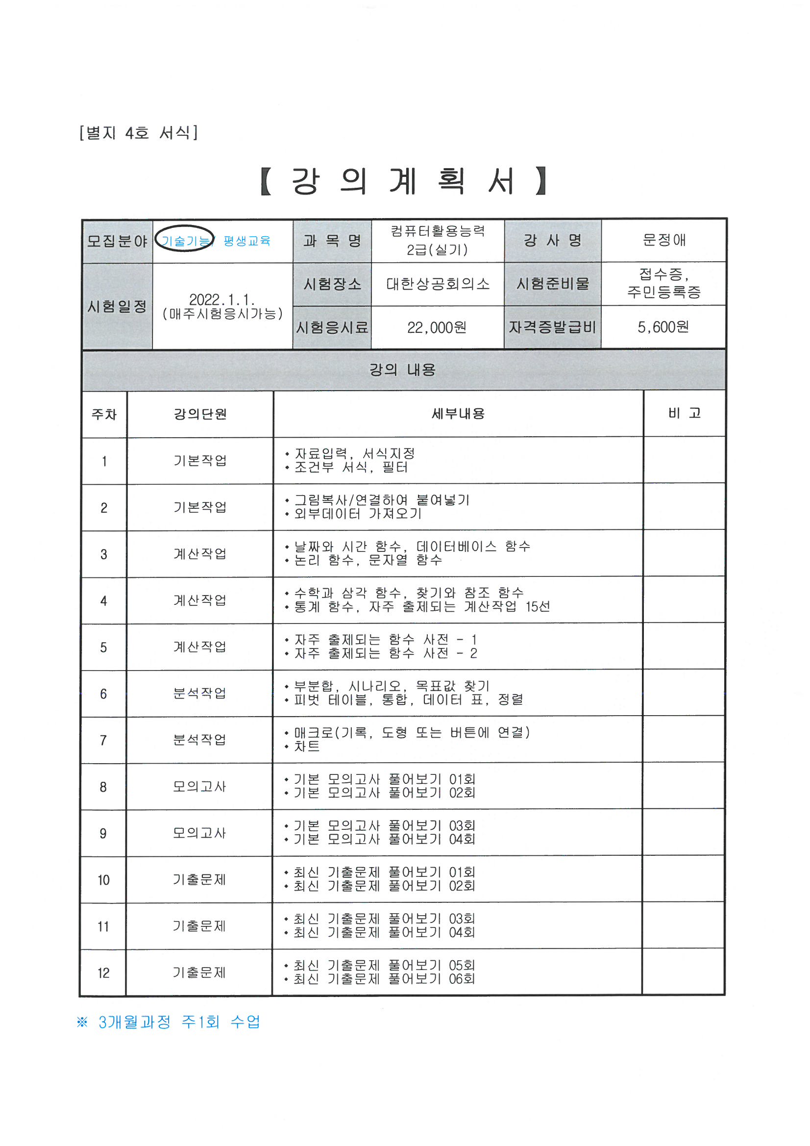 이체시 이름+컴활(과목명)함께 써주셔야하며,