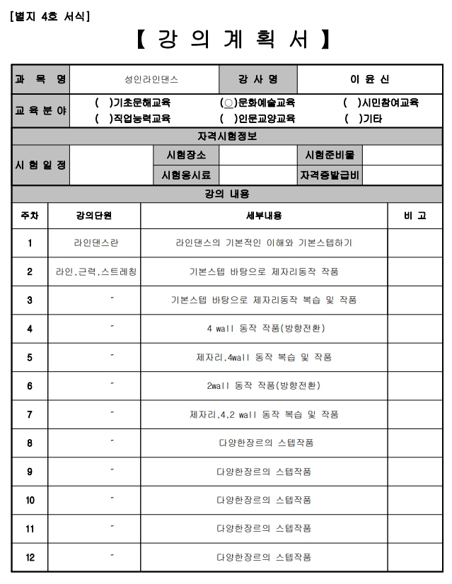 이체시 이름+댄스(과목명)함께 써주셔야하며,
