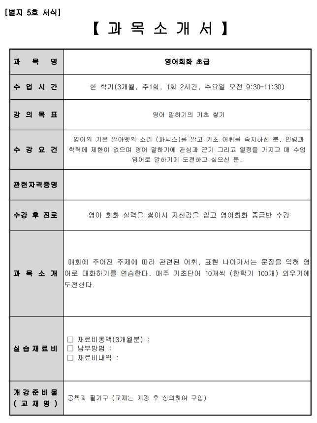 *수강료 감면 대상자:수강신청 후 증빙서류를 직접방문, 팩스, 메일 중 하나로 제출해주세요.
