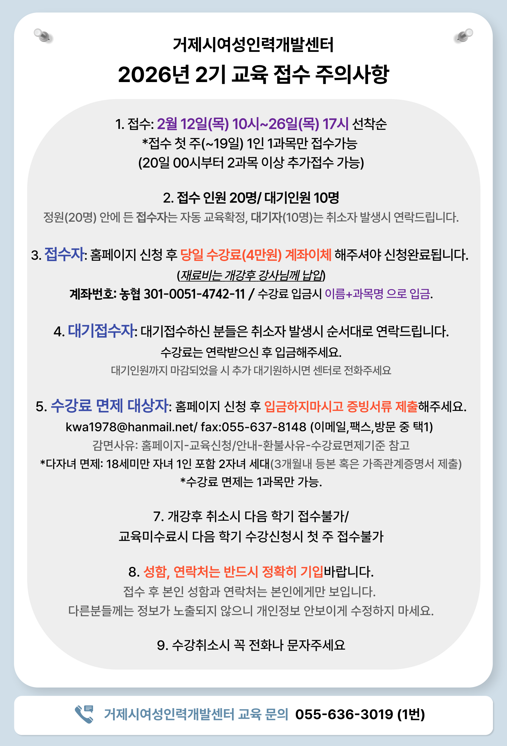 | 2 | 김OO | 0102051**** | 강좌접수 | 2026-02-12 10:04:52 |
