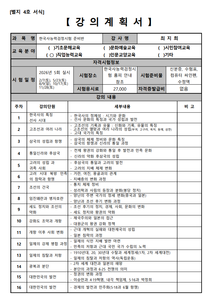 ※교육기간 중 휴일이 많아 1회 보강이 있습니다.