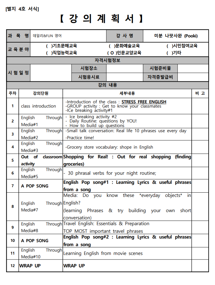 문법 수업은 하지 않습니다. 외국생활과 경험을 공유하고 일상 회화와 패턴영어, 팝송 등을 배울 수 있는 수업입니다.