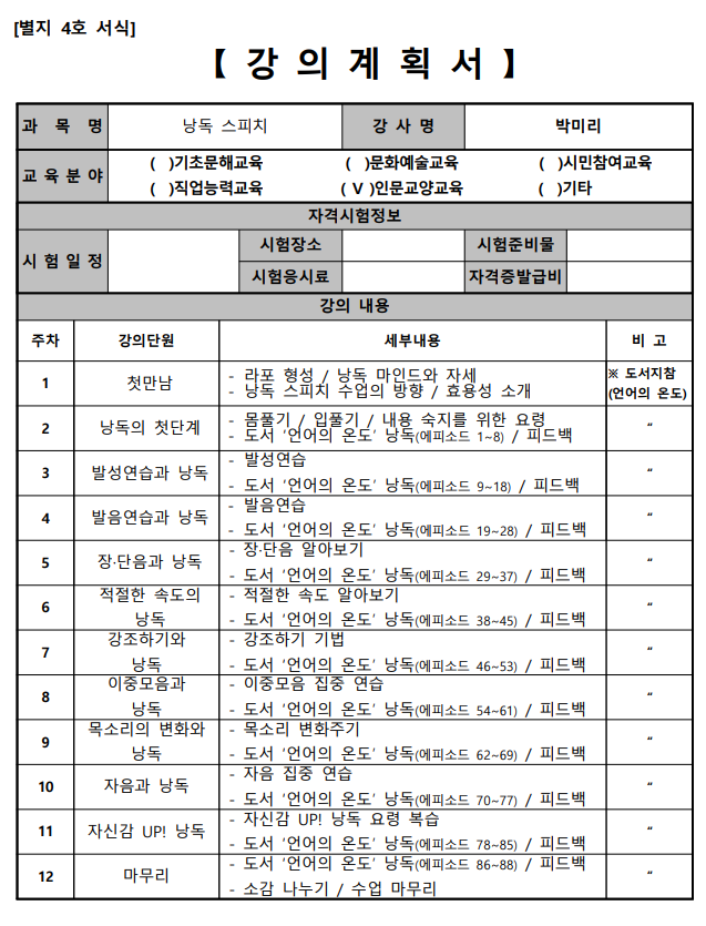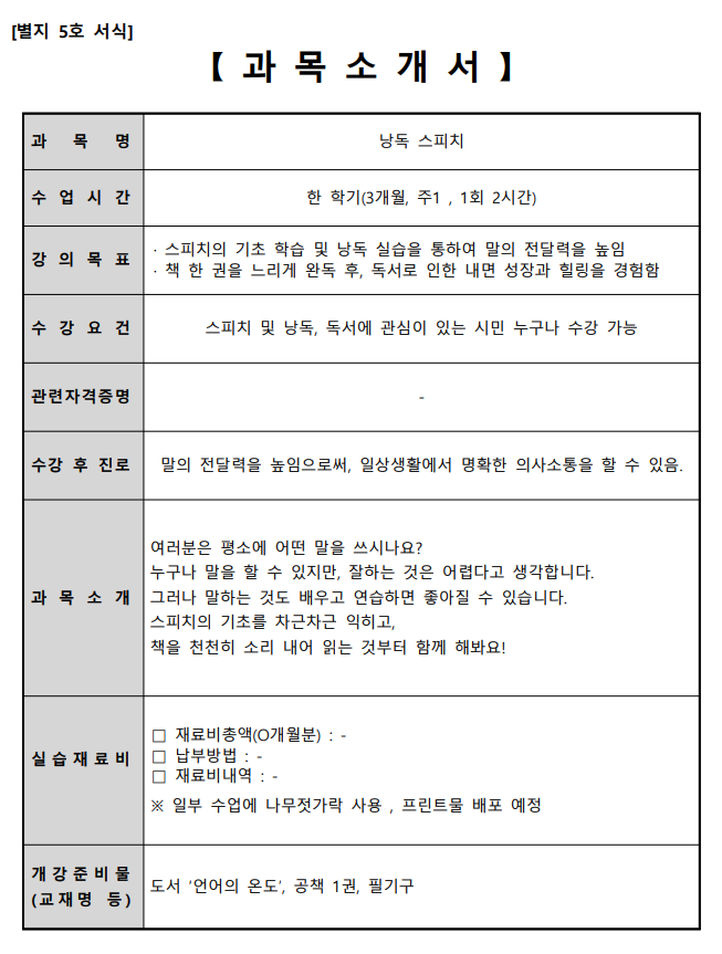 - 본 교육은 <언어의 온도> 책을 낭독하며 스피치의 기본기를 다지는 시간입니다. 함께 읽고 생각을 나누는 시간을 통해 내면 성장과 힐링을 기대할 수 있습니다.